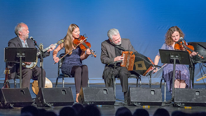 Mick Moloney (musical director, tenor banjo, octave mandolin, vocals), originally from County Limerick, was a member of The Johnstons folk group in Ireland before coming to the U.S. in 1973. In America, he teamed up with the much-loved fiddler Eugene O’Donnell while pursuing a Ph.D. in folklore at the University of Pennsylvania. They played together for over twenty years. He also performed during this time and recorded extensively with Robbie O’Connell and Jimmy Keane. Now a professor of music and Irish studies at New York University, Moloney is also a producer and performer in over 60 recordings and several documentary films, author of Far from the Shamrock Shore: The Story of Irish American History Through Song, editor of Close to the Floor: The Story of Irish Dance in America, and the recipient of the National Heritage Award. He currently plays with a variety of musicians including The Green Fields of America, an all-star group he formed in 1978 which helped launch the careers of young artists such as Eileen Ivers, Seamus Egan, Jean Butler, and Michael Flatley. In 2007, his album McNally’s Row of Flats from Compass Records was awarded the title of Best Irish Traditional Music Album of the Year by the Irish Echo and Top Album of the Year by Irish Livies, the latter awarded again for his 2009 album If It Wasn’t For the Irish and the Jews. Most recently, Moloney was awarded a 2013 Presidential Distinguished Service Award for the Irish Abroad, and a 2014 Gradam Ceoil Lifetime Achievement Award from TG4.